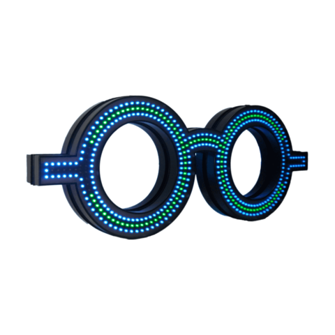 Rótulo led electrónico con forma de gafa, medidas: 1053 x 410 x 90 mms.
